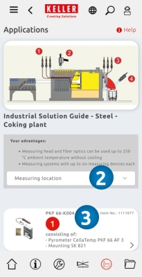 The Industrial Solution Guide is used to select the appropriate measuring system (3) for the conditions and measuring location (2) in the production plant after selecting the industry and application (1). All information and documents are available for the selected application solution.