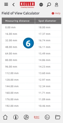 From the data, the exact diameter of the measuring field can be checked for the respective measuring distance in order to exclude a cut-off and thus an incorrect measurement when measuring through a viewing opening.